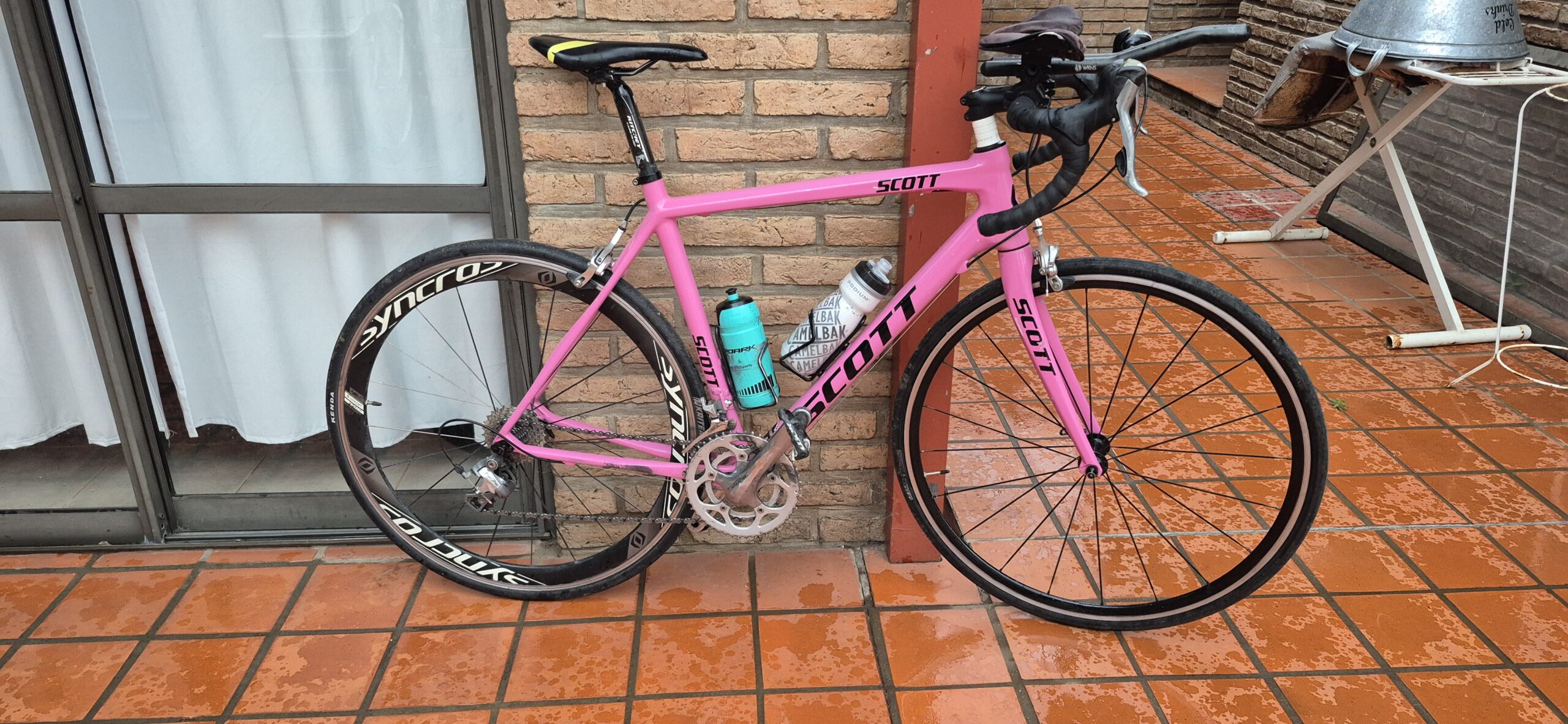 La otra es una Scott 2013, de carbono, rutera, y en su momento tremenda nave. Corrí como 100 triatlones. Ochenta shorts, veinte olímpicos, y seis medios Iron Man encima de esta. Y millones de quilómetros de entrenamientos. Le di duro. Las hicimos a todas. La he dejado prendida fuego con muy buenos tiempos. La Pantera Rosa hizo historia. Me han colgado de la horqueta también, yendo en mal estado. Es una resiliente y delicada máquina. Vieja, elegante y picante.